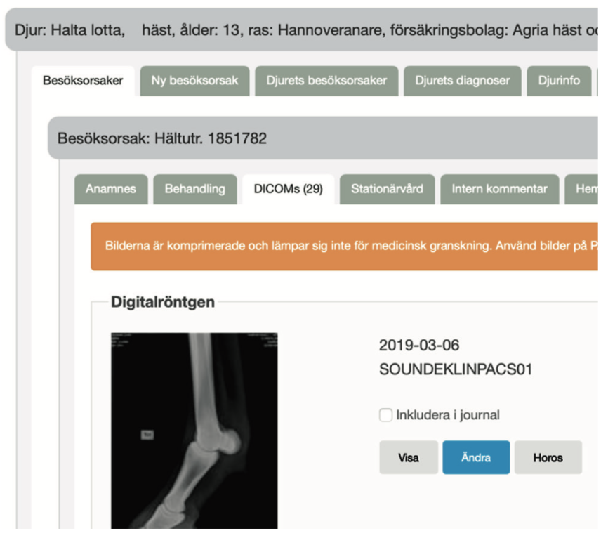 Röntgenbilderna rätt in i VetmanagerDu kan automatiskt få in bilder från röntgen, ultraljud mm i besöket. Välj vilka av bilderna du vill ha med i journalen. Det går naturligtvis att rita och göra förklaringar i bilderna. De kan även enkelt bifogas i pdfen med röntgenutlåtande.